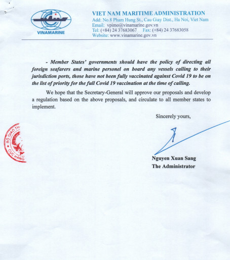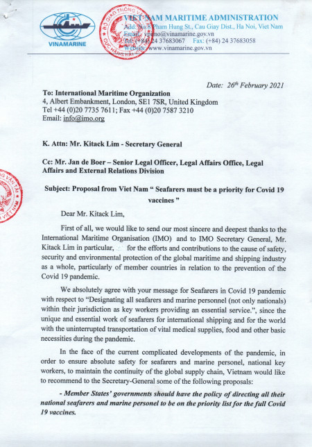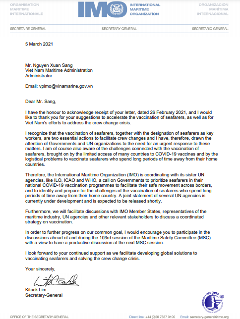 Thực hiện chủ trương của Tổ chức Hàng hải Quốc tế (IMO) về tạo điều kiện thuận lợi nhất cho thuyền viên, xem thuyền viên đang làm việc trên các tuyến vận chuyển quốc tế là lực lượng được ưu tiên “Chủ chốt” trong ngành vận tải biển trong bối cảnh đại dịch Covid-19 đang xảy ra phức tạp trên Thế giời, ngày 26/02/2021, Cục Hàng hải Việt Nam có gửi thư thông báo về thực hiện chủ trương nói trên. Đến ngày 05/3/2021, Tổ chức Hàng hải Quốc tế (IMO) có thư phản hồi về ý kiến đễ xuất của Viêt Nam. Theo đó, sẽ đưa nội dung này để các thành viên IMO trao đổi tại cuộc họp trực tuyến sắp tới lần thứ 103 của Ủy ban An toàn hàng hải (MSC 103) sẽ được tổ chức từ ngày 05-14/5/2021 đính kèm theo 02 thư.